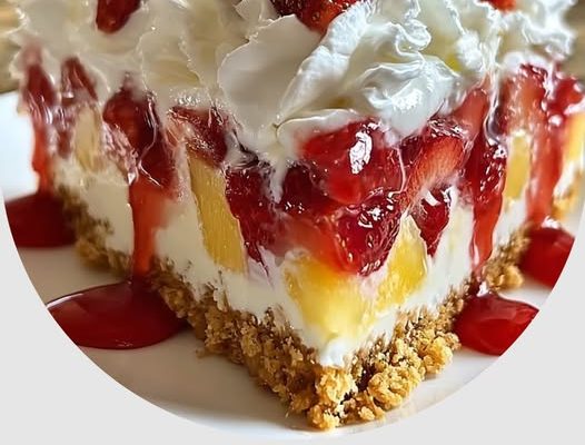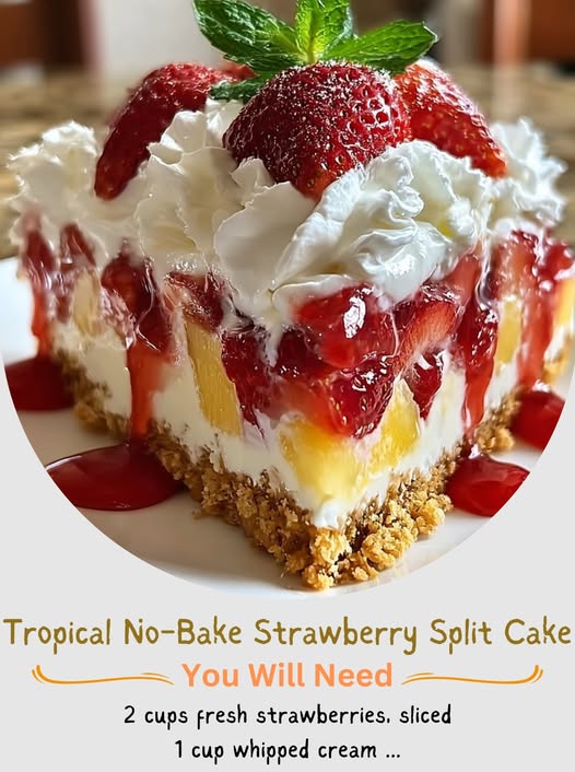 If you’ve ever wished for a dessert that tastes like a tropical vacation but doesn’t require an oven, the tropical no-bake strawberry split cake is exactly what you need. This chilled treat combines the juicy sweetness of fresh strawberries, the tropical tang of pineapple, and the silky smoothness of cream cheese and pudding, all layered over a crunchy graham cracker crust. It’s perfect for summer barbecues, family gatherings, and any occasion when turning on the oven feels like a crime against comfort.